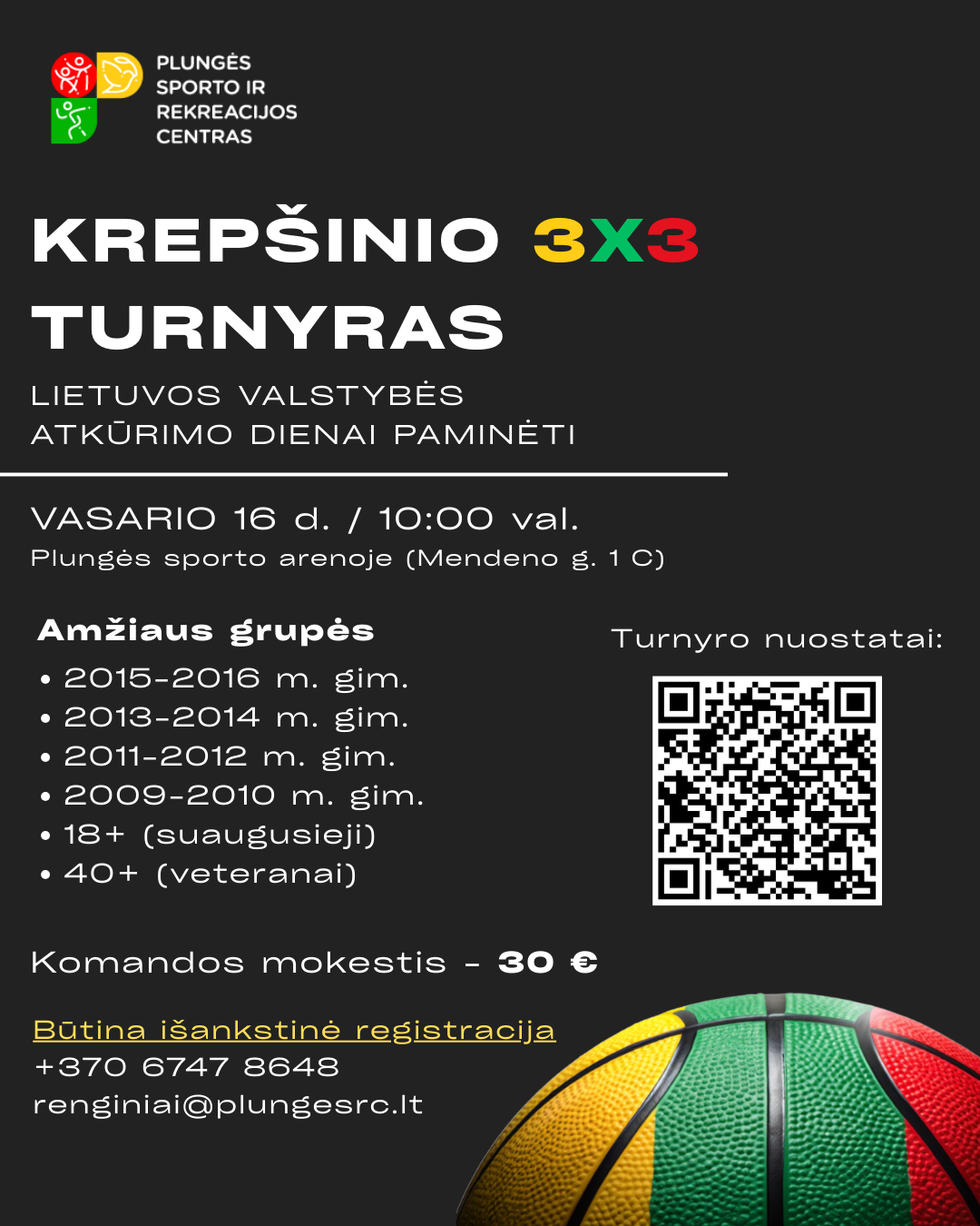 Plungės sporto ir rekreacijos centras kviečia į krepšinio 3×3 turnyrą Lietuvos valstybės atkūrimo dienai paminėti.