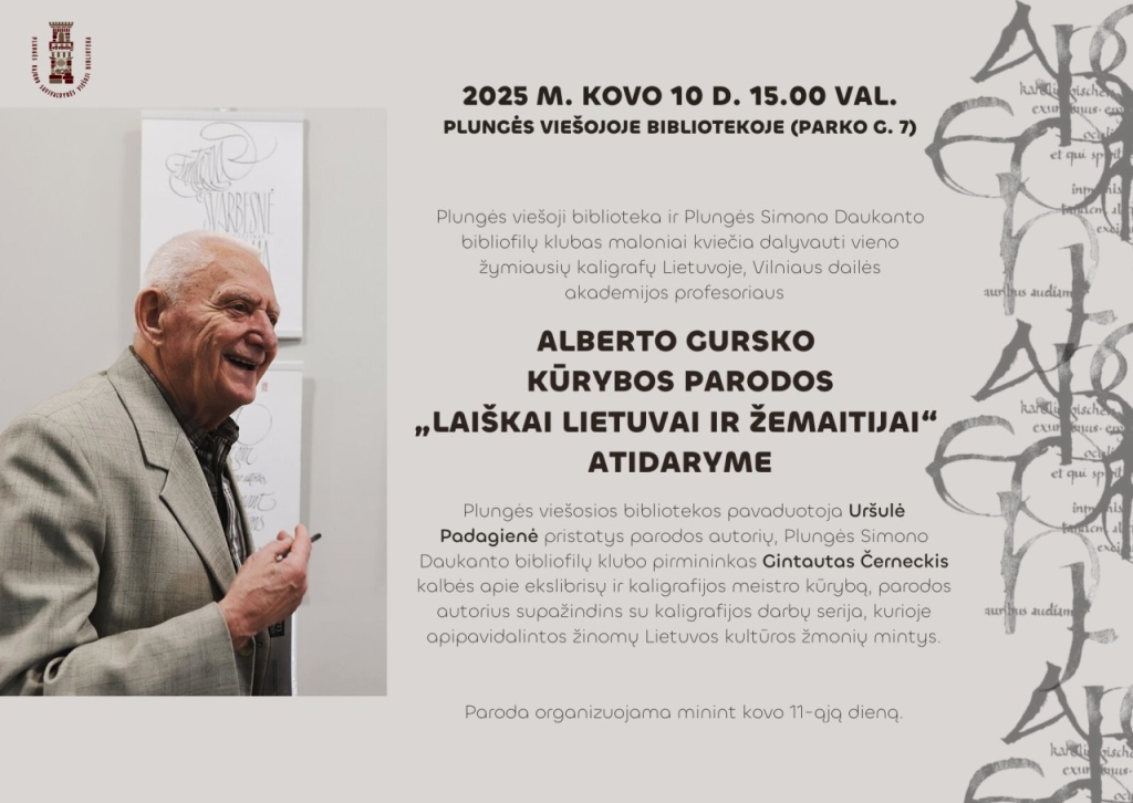 Plungės viešoji biblioteka ir Plungės Simono Daukanto bibliofilų klubas maloniai kviečia dalyvauti vieno žymiausių kaligrafų Lietuvoje, Vilniaus dailės akademijos prof. Alberto Gursko kūrybos parodos „Laiškai Lietuvai ir Žemaitijai“ atidaryme.