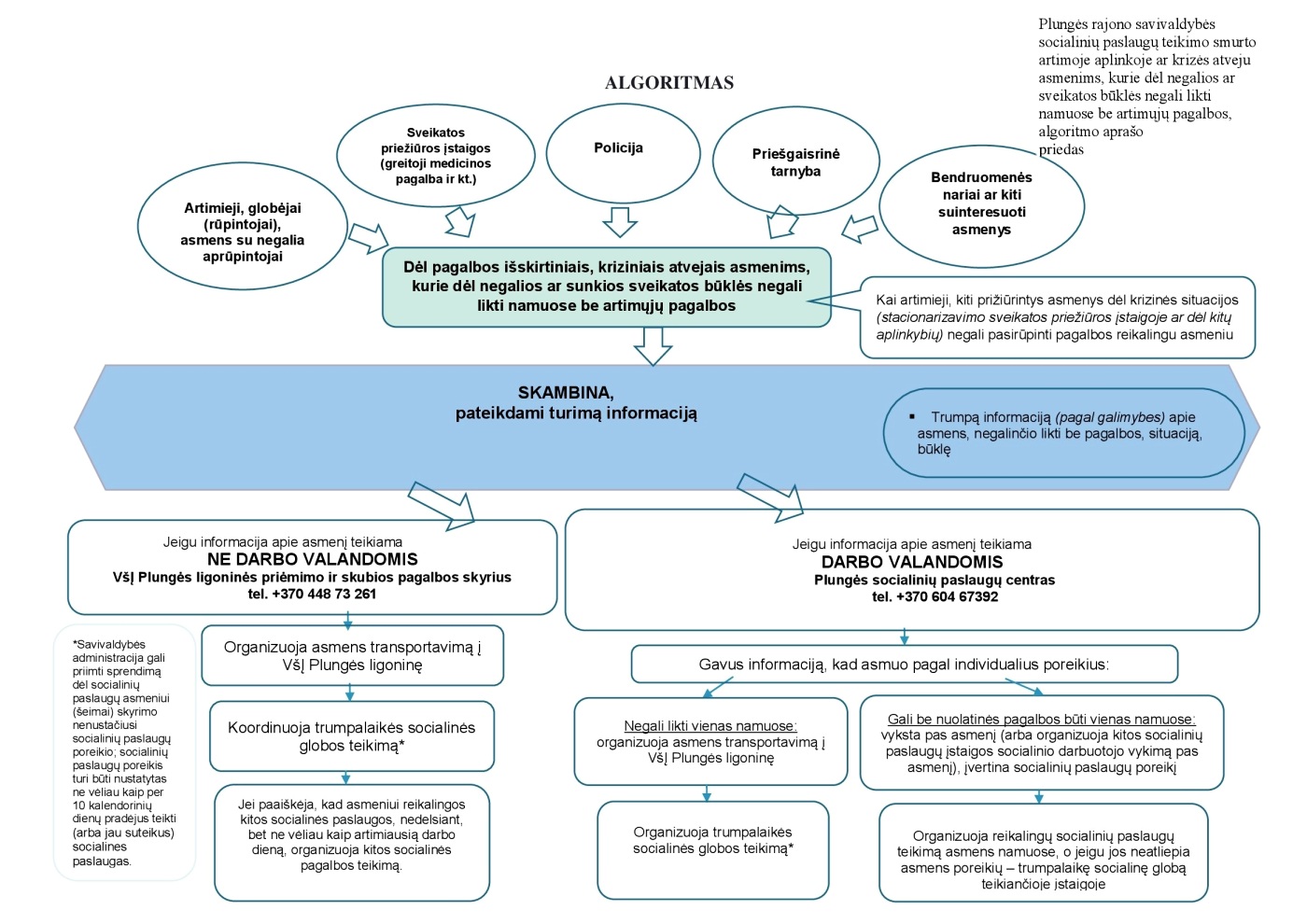 Siekiant užtikrinti operatyvią pagalbą išskirtiniais, kriziniais atvejais asmenims, kurie dėl negalios ar sunkios sveikatos būklės negali likti namuose be artimųjų priežiūros, tais atvejais, kai artimieji ar kiti juos prižiūrintys asmenys dėl objektyvių priežasčių (pavyzdžiui, stacionarinio gydymo ar kitų nenumatytų aplinkybių) laikinai negali suteikti reikalingos pagalbos, yra taikomas Plungės rajono savivaldybės administracijos direktoriaus 2025 m. sausio 21 d. Nr. DE-31 patvirtintas pagalbos organizavimo algoritmas.