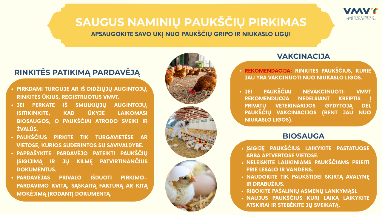 „Prasidedantis paukščių migracijos ir pavasario prekybos sezonas yra didžiausios rizikos metas, kai bandymas sutaupyti gali brangiai kainuoti visam ūkiui. Augintojai privalo suprasti, kad pirkdami paukščius iš neatsakingų prekeivių jie į savo kiemą gali parsivežti ne tik naujus gyvūnus, bet ir žaibiškai plintančią ligą. Griežta biosauga ir paukščių įsigijimas tik iš registruotų, atsakingų pardavėjų yra vienintelis būdas išvengti masiškų nuostolių ūkiui ir visai šaliai galimų eksporto apribojimų, nustačius ligos židinį“,– kalbėjo VMVT Gyvūnų sveikatingumo skyriaus patarėja Kristina Stakytė.