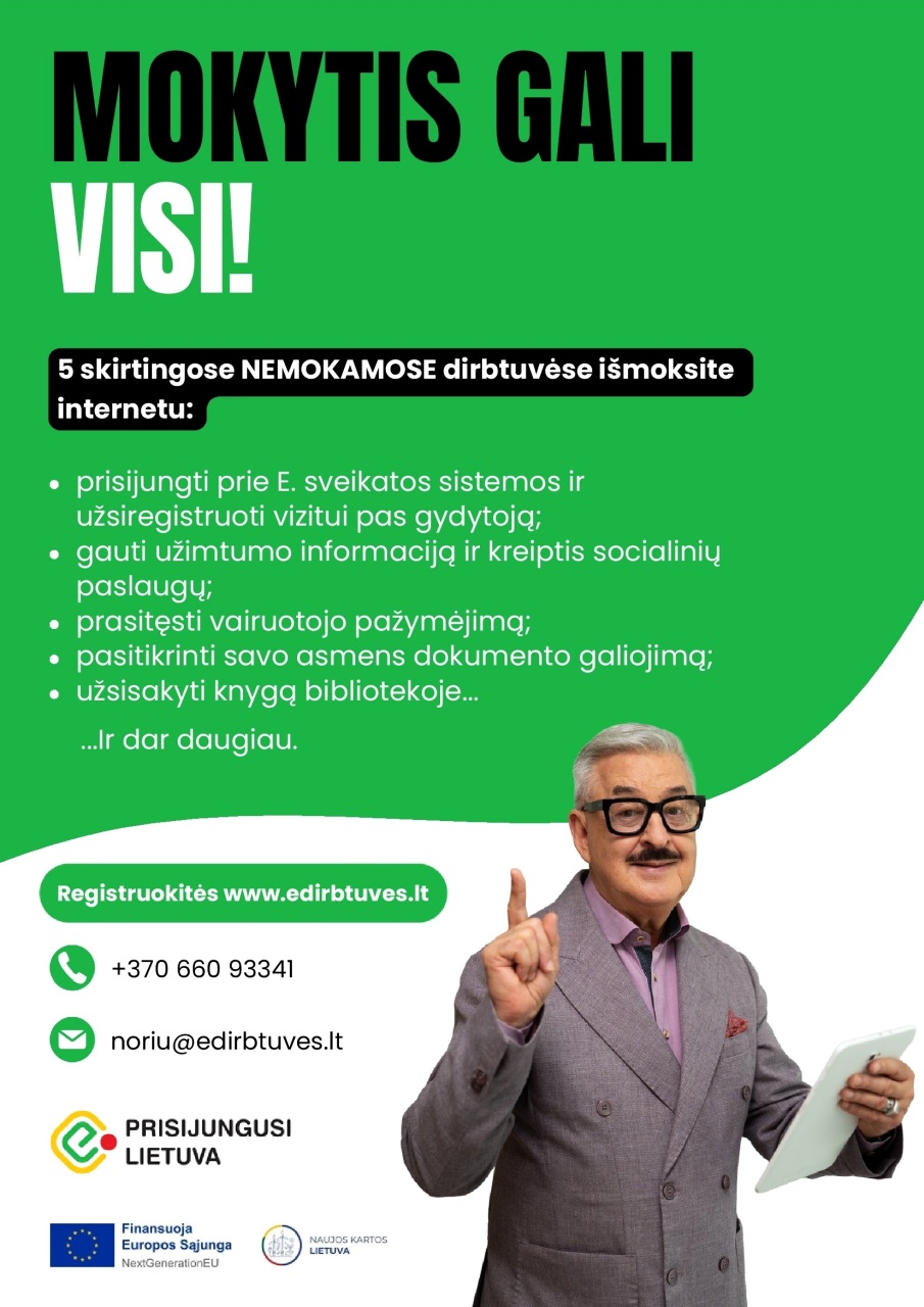 Projektas „Prisijungusi Lietuva: skaitmeninių įgūdžių tobulinimas“ toliau padeda gyventojams tobulinti skaitmeninius įgūdžius, reikalingus naudotis viešosiomis elektroninėmis paslaugomis. Mokymuose ir dirbtuvėse gyventojai susipažins su sveikatos, transporto, asmens dokumentų išdavimo, „SoDros“ ir daugeliu kitų viešųjų e. paslaugų, išmoks jomis naudotis.