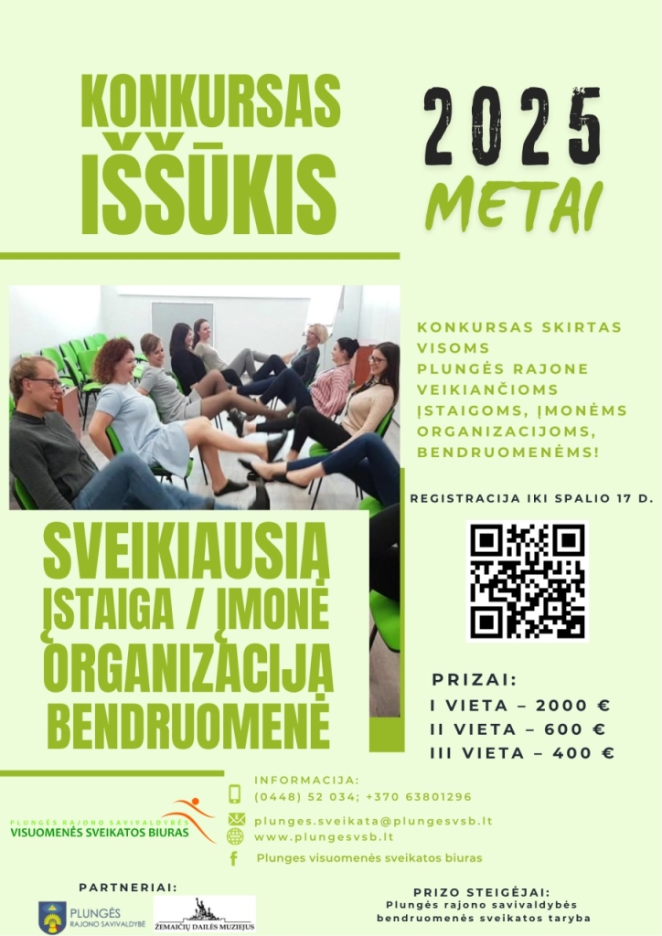 Plungės rajono savivaldybės visuomenės sveikatos biuras kviečia įmones, įstaigas, organizacijas, bendruomenes dalyvauti konkurse „Sveikiausia įmonės, įstaigos, organizacijos, bendruomenės komanda 2025 m.“.