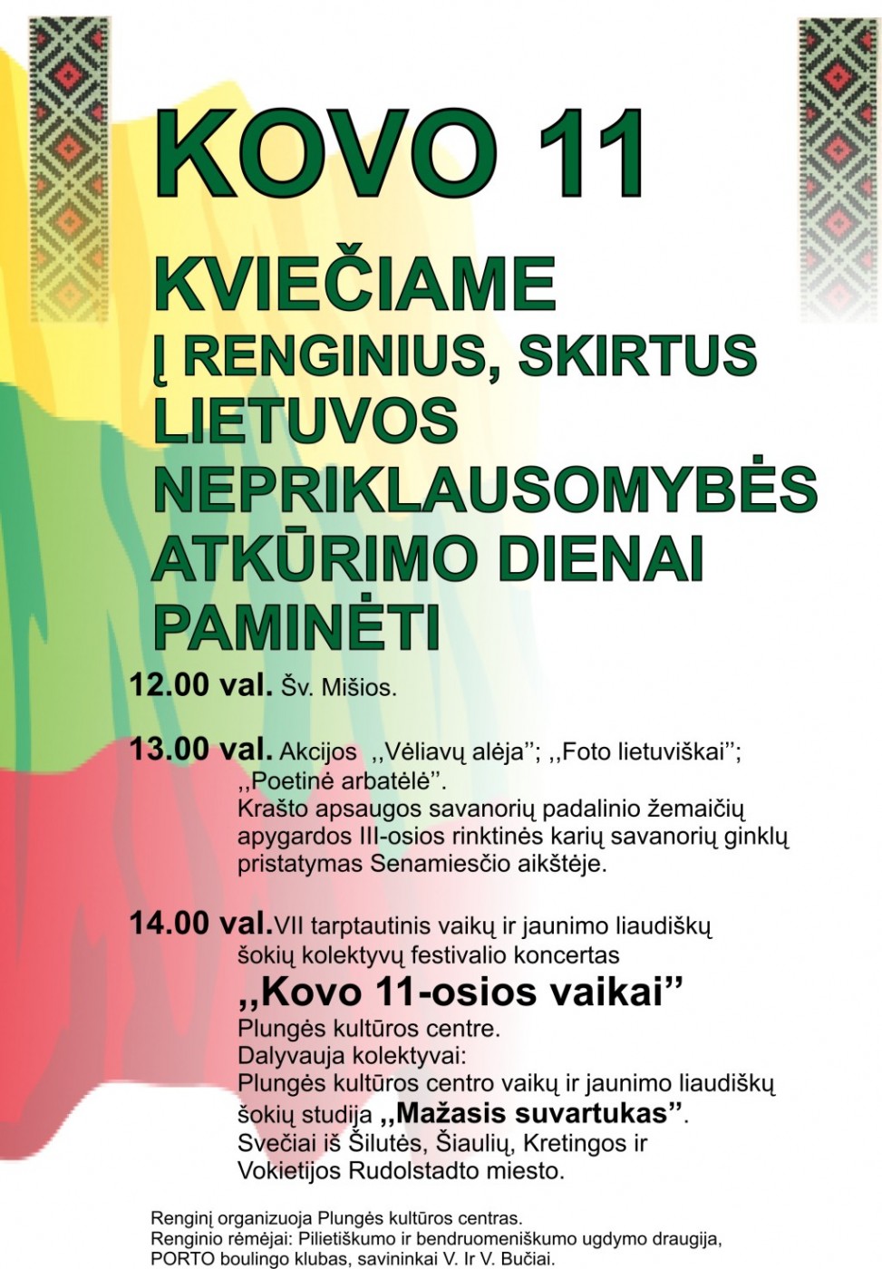 Festivalio dalyviai Kovo 11-ą plungiÅ¡kius džiugins ne tik baigiamuoju festivalio renginiu – Å¡ventiniu koncertu, bet ir dalyvaus akcijose „Vėliavų alėja“, „Foto lietuviÅ¡kai“, „Poetinė arbatėlė“. Jie taip pat stebės KraÅ¡to apsaugos savanorių padalinio Žemaičių apygardos III –osios rinktinės savanorių ginklų pristatymą Senamiesčio aikÅ¡tėje bei surengs koncertą – susitikimą su Senamiesčio vidurinės mokyklos bendruomene.