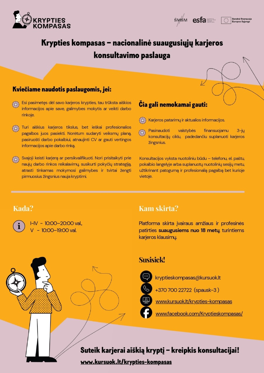 Taip pat kviečiame sekti „Krypties kompaso“ „Facebook“ paskyrą », kur reguliariai dalinamasi praktine informacija ir karjeros patarimais.