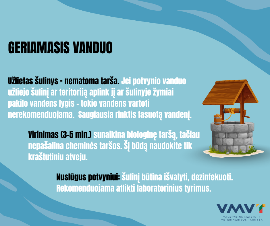 Vartojimo ribojimas: jei potvynio vanduo užliejo šulinį ar teritoriją aplink jį ar šulinyje žymiai pakilo vandens lygis – tokio vandens vartoti maistui, higienai ar maisto ruošimui nerekomenduojama. Saugi alternatyva – fasuotas geriamasis vanduo.
