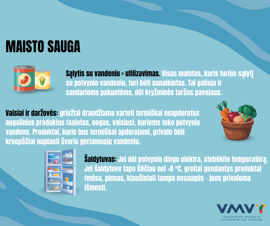 Vaisiai ir daržovės: griežtai draudžiama vartoti termiškai neapdorotus augalinius produktus (salotas, uogas, vaisius), kuriems teko potvynio vandens. Produktai, kurie bus termiškai apdorojami, privalo būti kruopščiai nuplauti švariu geriamuoju vandeniu.