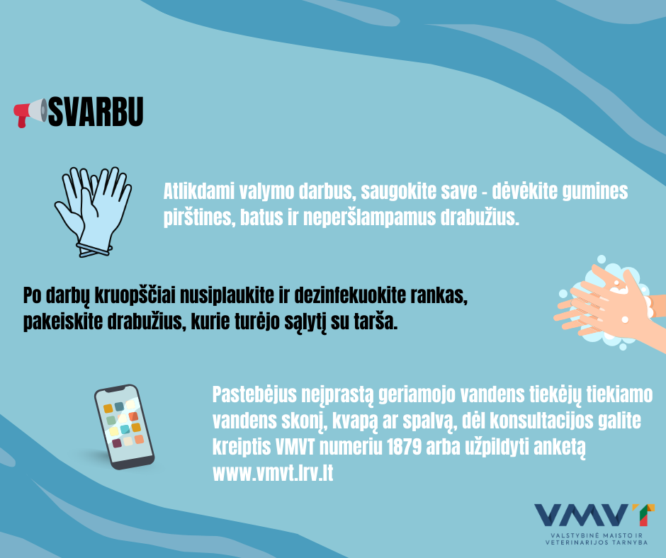 VMVT primena: Pastebėjus neįprastą geriamojo vandens tiekėjų tiekiamo vandens skonį, kvapą ar spalvą, dėl konsultacijos galite kreiptis VMVT numeriu 1879 arba užpildyti anketą www.vmvt.lrv.lt