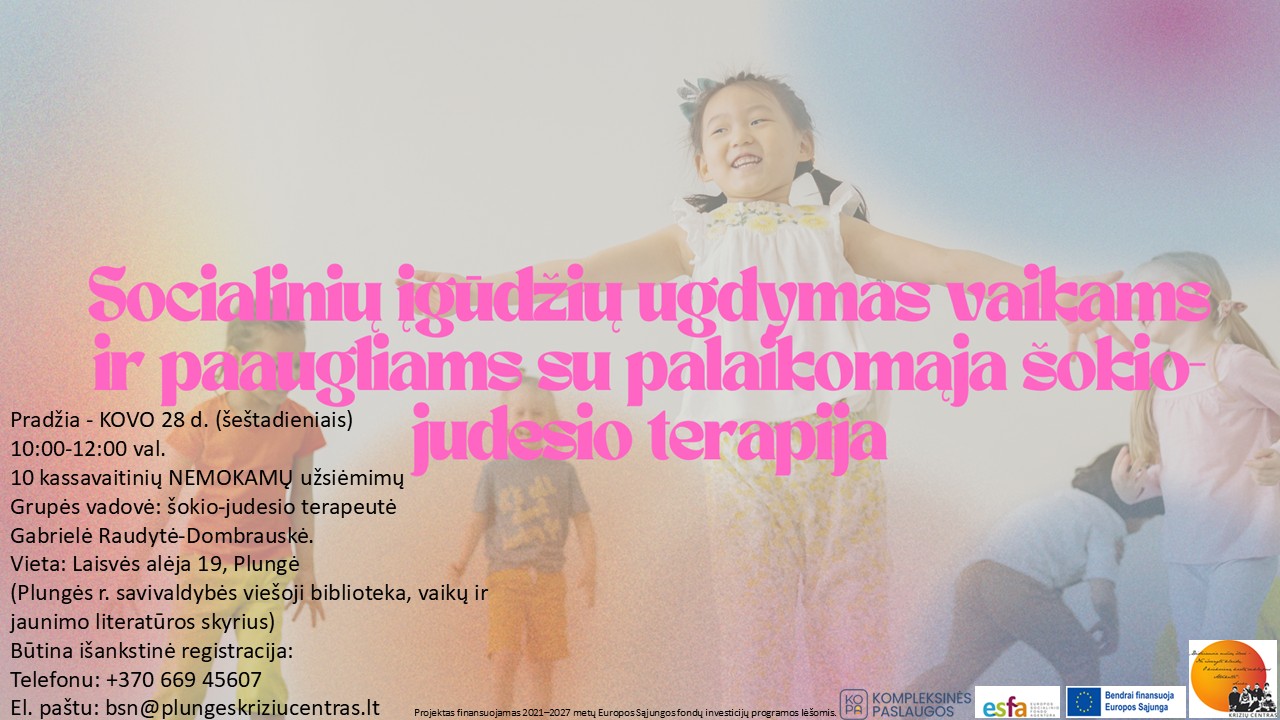 Kviečiame registruotis į socialinių įgūdžių ugdymo grupę vaikams ir paaugliams su palaikomąja šokio-judesio terapija „Judančios istorijos”.